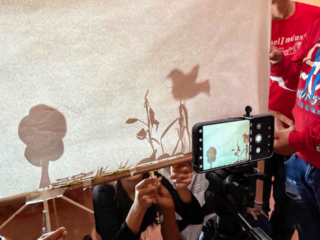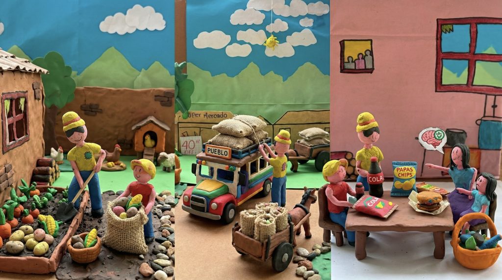 Posteriormente, los y las participantes se organizaron en grupos para definir las temáticas y las técnicas narrativas a trabajar. Uno de los grupos abordó el Derecho a la Alimentación a través de animación con personajes de plastilina, mientras que el otro grupo desarrolló una historia en torno a la paz y la agroecología utilizando la técnica de sombras, mediante el uso de siluetas, papel y luz, en una puesta en escena inspirada en el teatro de sombras.